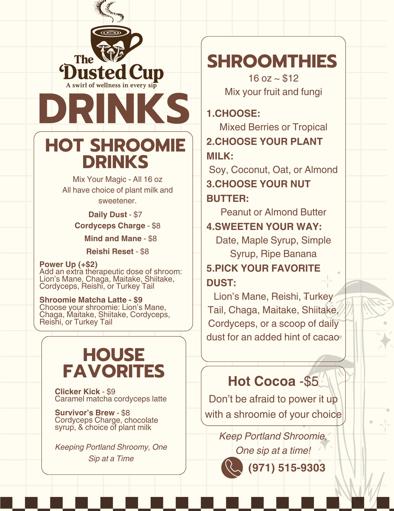 We offer plant-based mushroom drinks and nourishing food for corporate wellness events, retreats, university functions, and private gatherings. Our downtown café is also available for private events up to 30 guests.